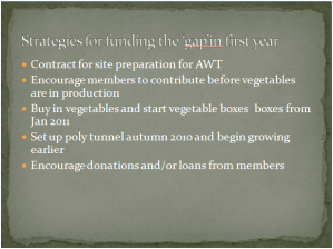 Developing an implementation schedule taking into account the need to develop the infrastructure of the site and deliver weekly veg shares to members.