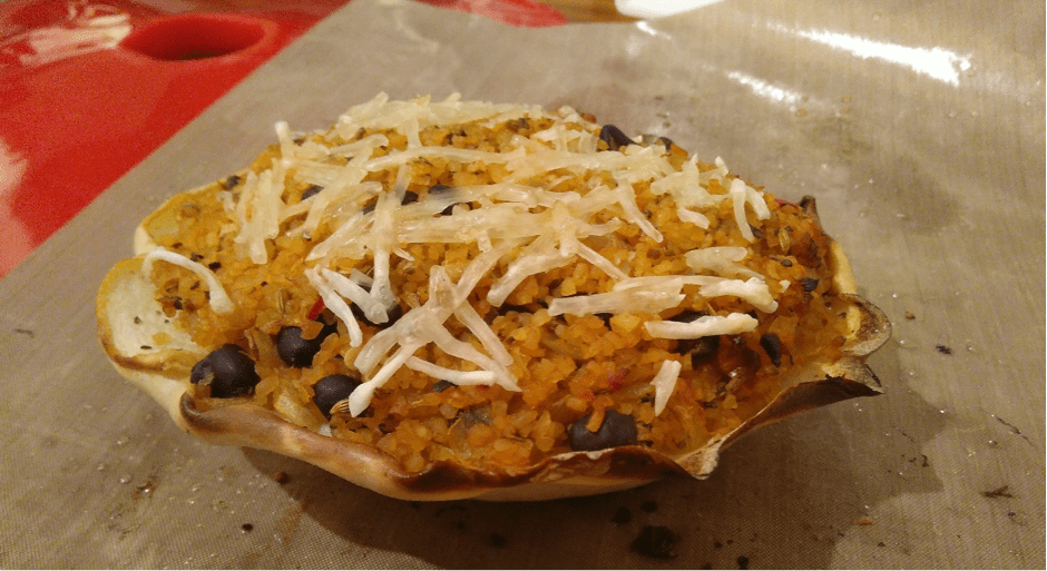 When the stuffing mixture is cooked, add ½ tin of black beans, stir. Get pattypan out of oven, pack the stuffing mixture into the scooped out hollow and covering as much of the rest of the cut surface as possible, pressed down with a spatula. Sprinkle grated vegan cheese if desired. Return to the oven for 20 minutes or until browned.