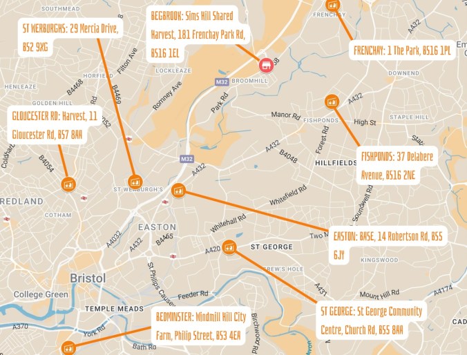 All shares are delivered by 5pm on Thursdays, and you can pick up any time after that until Sunday morning. Depending on your location there may be slightly different timings, but some points (e.g. Easton, St Werburgs) are 24 hour access.